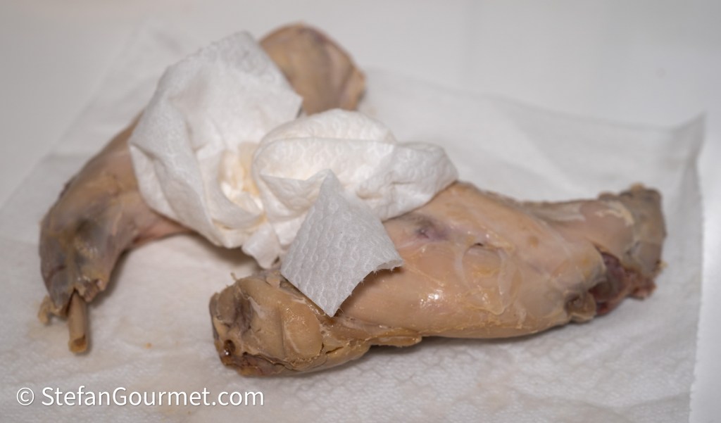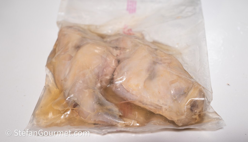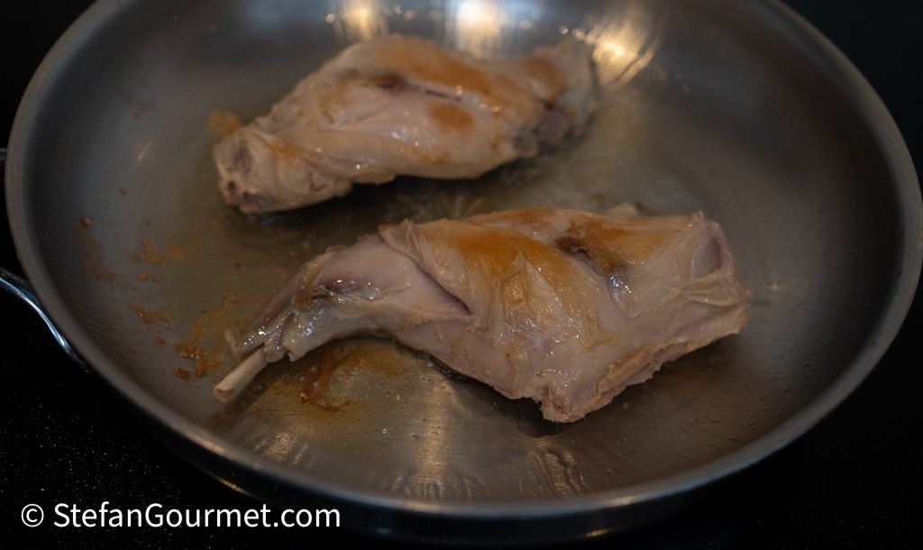 Sous vide garing van het konijn is niet noodzakelijk voor dit gerecht, maar wel lekker makkelijk omdat het niet kan mislukken. Konijn in een braadpan stoven kan ook en geeft als het goed gaat hetzelfde resultaat als met sous vide, maar kan ook heel snel droog worden. Een extra reden om het konijn sous vide te garen was dat ik het met de kerstdagen wilde serveren, terwijl de konijnenbouten die ik had gekocht niet meer houdbaar waren tot kerst. Door het vlees sous vide te garen, kon ik de houdbaarheid flink verlengen.