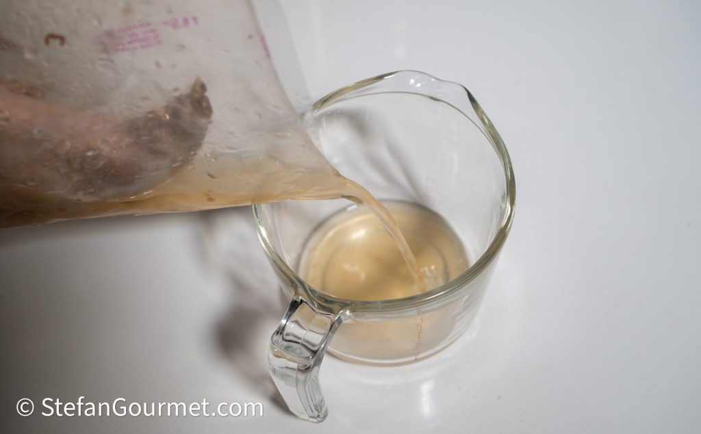 Giet het vocht uit de zak in een kom of maatbeker en zet het apart.
