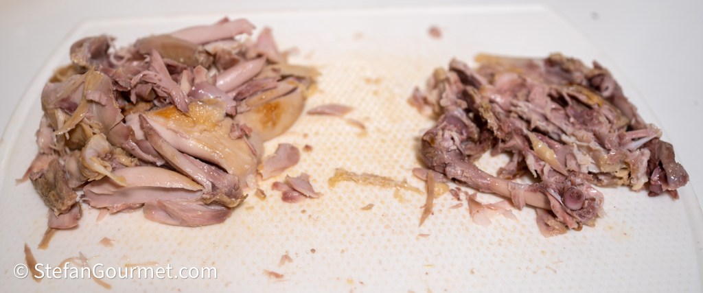 Laat het vlees even afkoelen, zodat je je vingers niet brandt. Pluk dan het vlees van de botjes. Houd het vlees en de botjes apart.