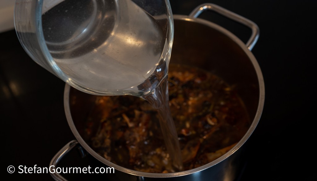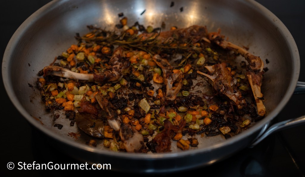 Plaats de pan ongeveer een half uurtje in de oven op 190 graden, totdat alles mooi bruin is, maar niet zwart. Door het roosteren van de groente, kruiden en botten krijgt de jus een diepere, donkere smaak.