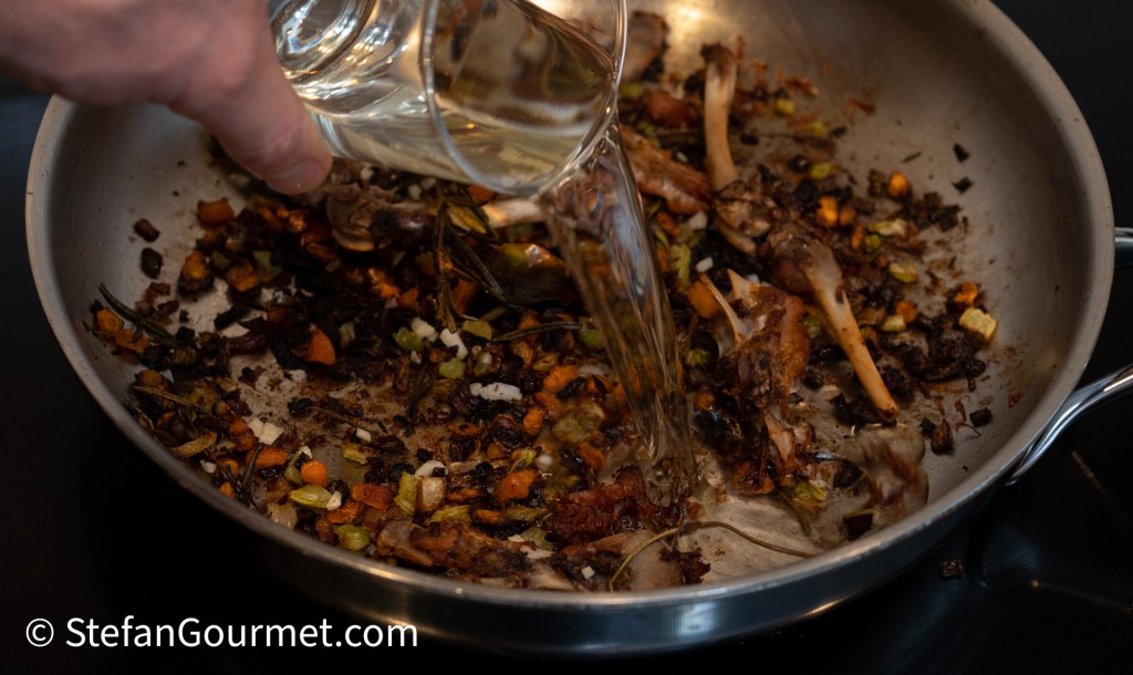 Leg wortel, ui, bleekselderij, rozemarijn, tijm, laurier, oregano (optioneel) en de botjes in de pan waarin je het konijn hebt aangebakken.