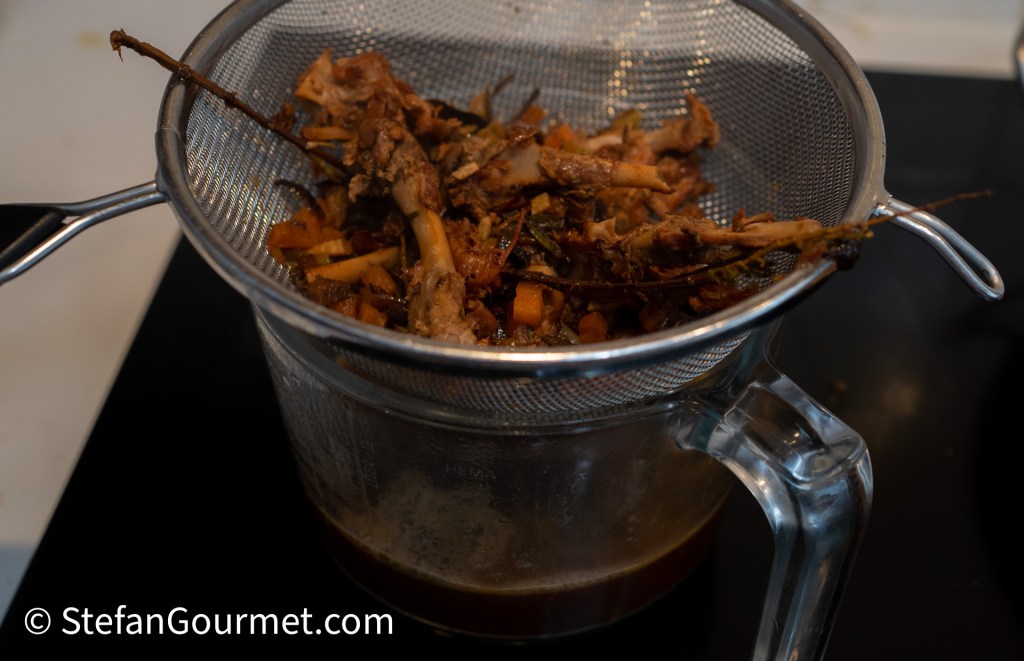 Zeef de bouillon en gooi de vaste delen weg.