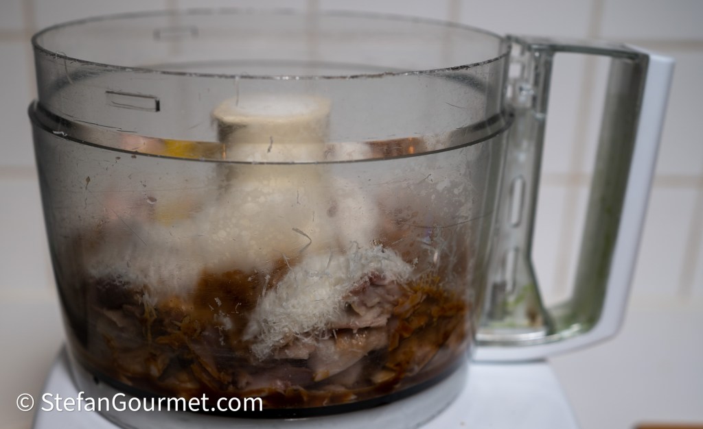 Laat de jus iets afkoelen. Doe het konijnenvlees dat je van de botten had geplukt in de keukenmachine samen met 1 ei, 20 gram versgeraspte parmezaanse kaas en 120 ml konijnenjus.