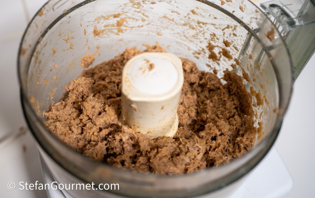 Gebruik de pulse knop van de keukenmachine om dit fijn te hakken en te mengen. Het moet niet te glad worden. Proef en voeg naar smaak zout en versgemalen zwarte peper toe. Let op: als je de vulling van ravioli los proeft, moet hij iets te sterk gekruid zijn. In de ravioli is hij dan precies goed.