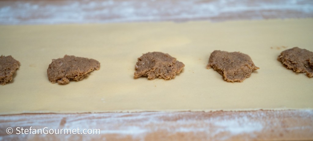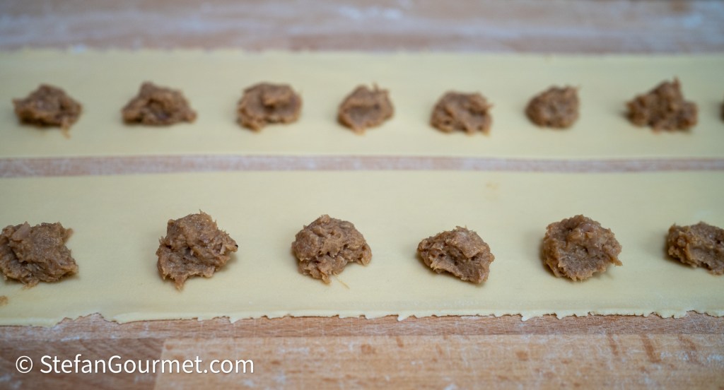 …of grote ravioli met bolletjes vulling ter grootte van een flinke walnoot. Bij de kleine ravioli kun je een strook pasta van 15 cm breed verdelen in twee stroken van 7,5 cm.