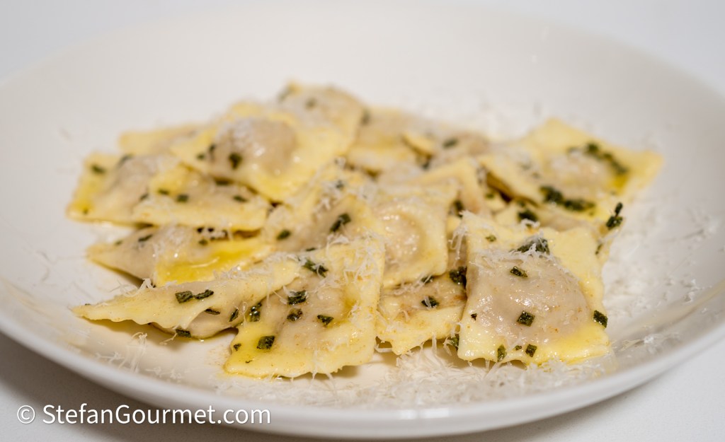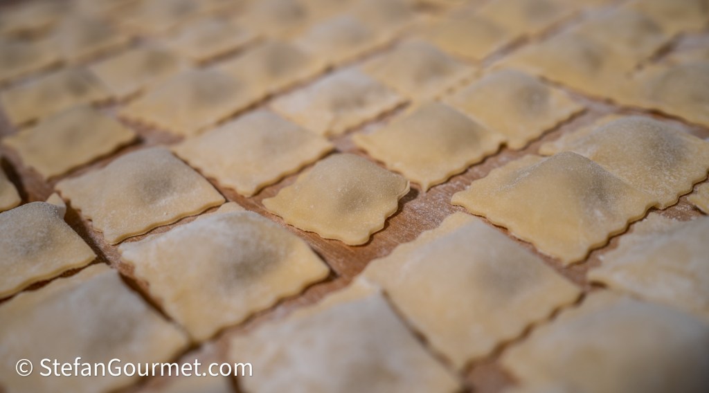 Zelfgemaakte ravioli zijn mijn ‘signature dish’. Het is wel even een klusje om ze te maken, maar als je daar eenmaal handigheid in hebt gekregen, valt het ook wel weer mee. Het helpt wel heel erg om een keukenmachine te hebben (Kenwood, KitchenAid, e.d.) waarmee je het deeg kunt kneden en de pasta kunt uitrollen. Met de hand is het nog veel meer werk.
