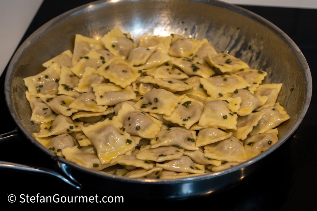 Hussel de ravioli voorzichtig met de boter of jus.