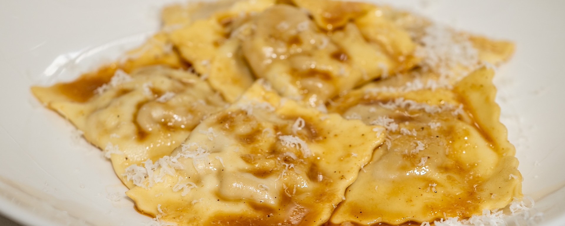 Serveer de ravioli op voorverwarmde borden en rasp er nog wat parmigiano over.