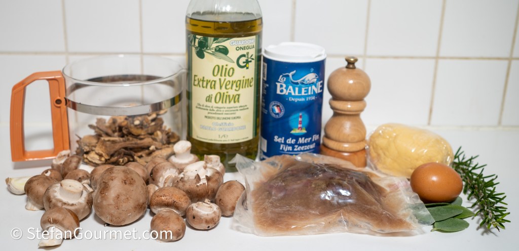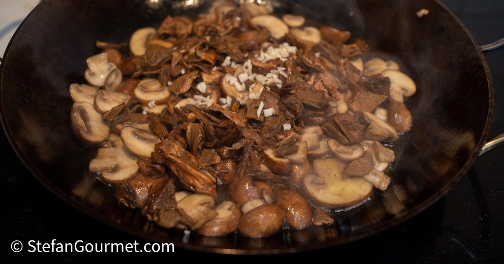 Je kunt de paddenstoelensaus ook van tevoren maken en dan later opwarmen om te serveren. Doe 30 gram gedroogd eekhoorntjesbrood in een kom en giet er 250 ml kokend water over. Laat dit een kwartiertje weken.