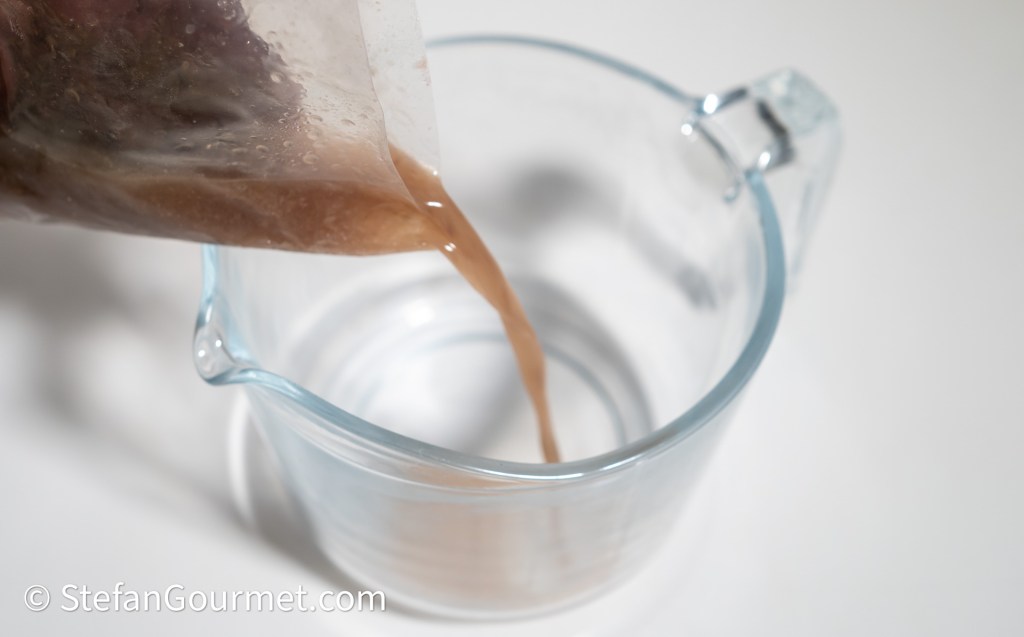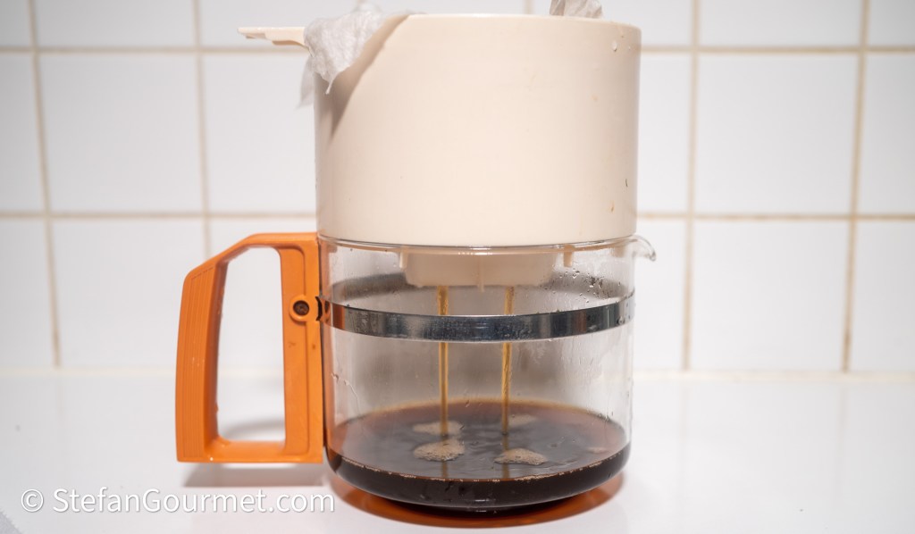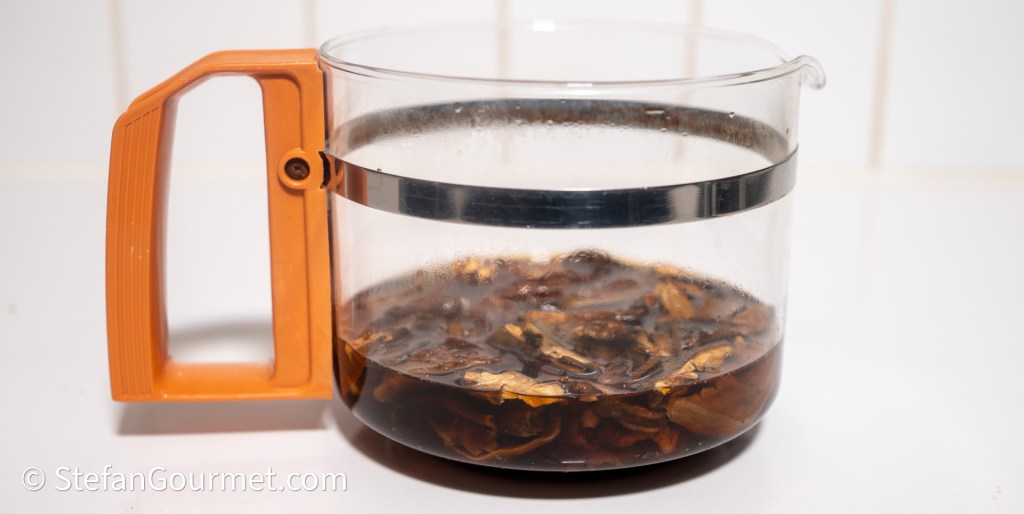 Giet de paddenstoelen daarna door een vergiet, waarbij je het weekvocht opvangt. Filter het weekvocht vervolgens met een koffiefilter of keukenpapier. (Ik gebruik hiervoor de kan en filterhouder van een oud koffiezetapparaat.)