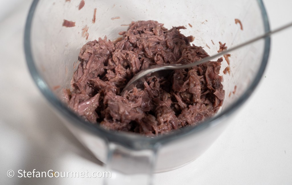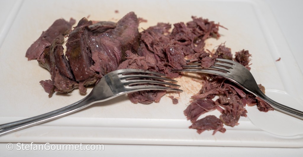 Trek het vlees vervolgens met twee vorken uit elkaar, zodat je ‘pulled zwijn’ krijgt.
