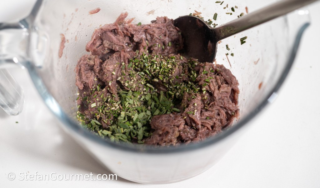 Voeg 1/2 eetlepel fijngehakte verse rozemarijn en 1/2 eetlepel fijngehakte verse salie toe.