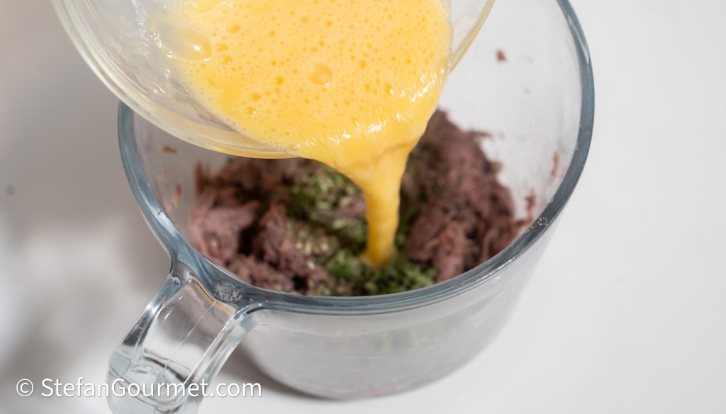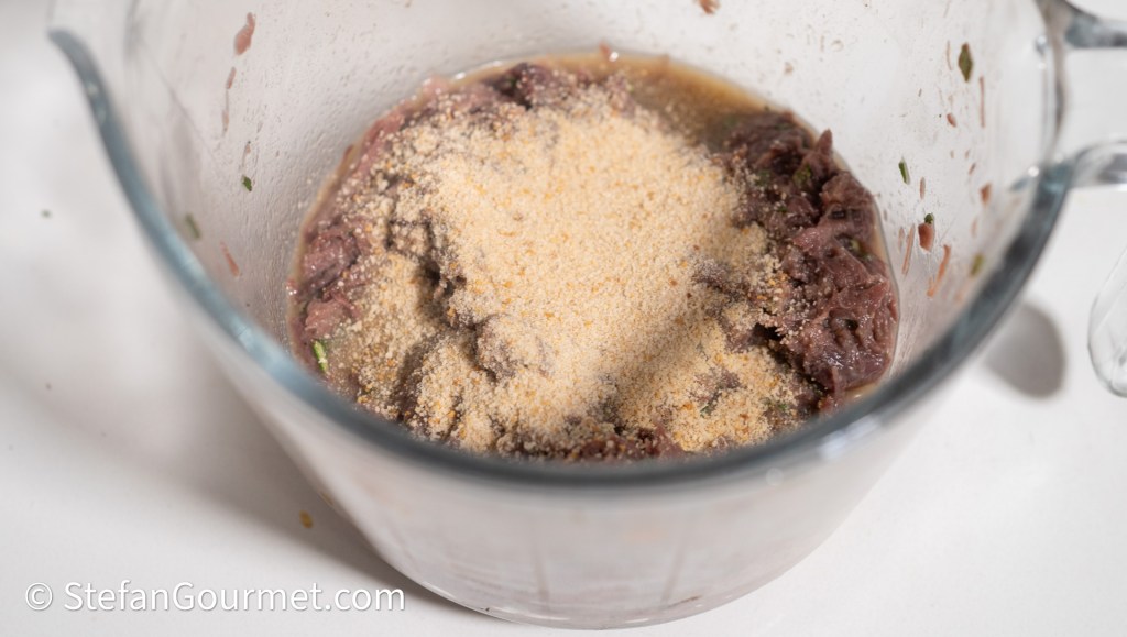 Voeg ongeveer 2 eetlepels paneermeel toe en roer het mengsel goed door elkaar. Het mengsel moet niet te droog zijn en niet te nat. Dit kun je bereiken door eerst 1 eetlepel paneermeel toe te voegen en daarna alleen meer paneermeel toe te voegen als dat nodig is om de juiste textuur te krijgen.