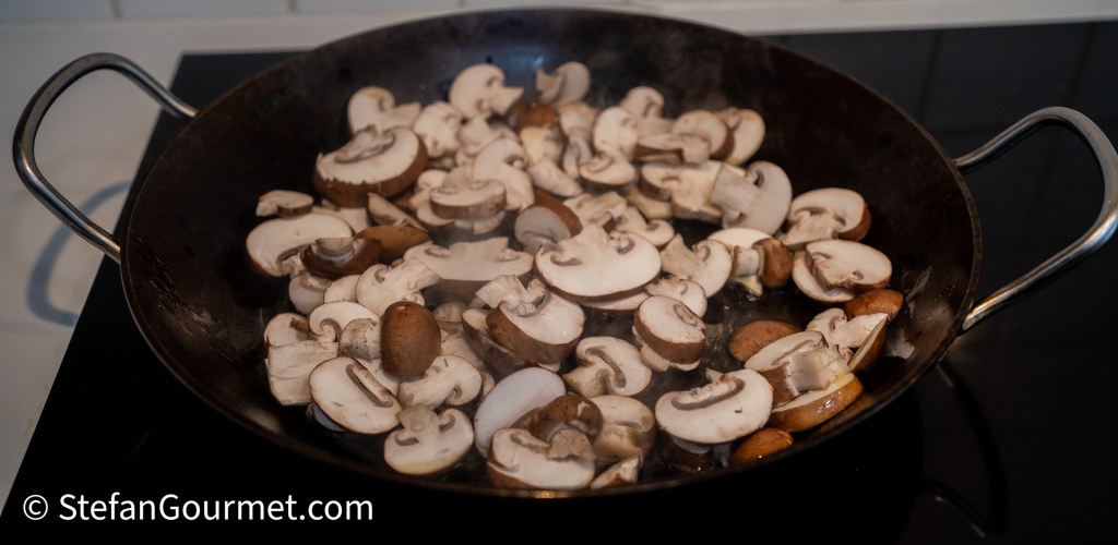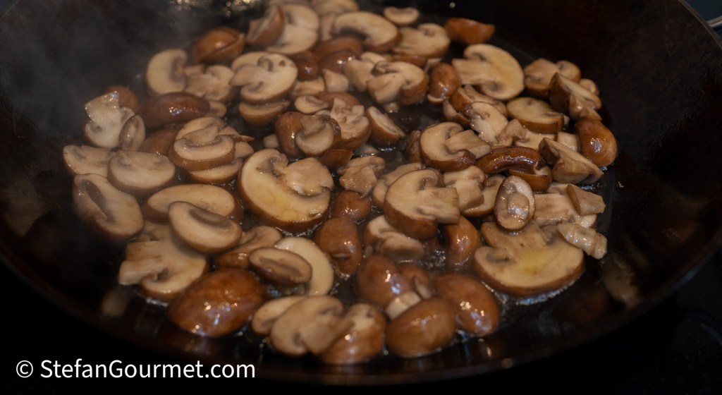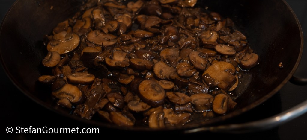 Bak de champignons tot ze bijna gaar zijn.