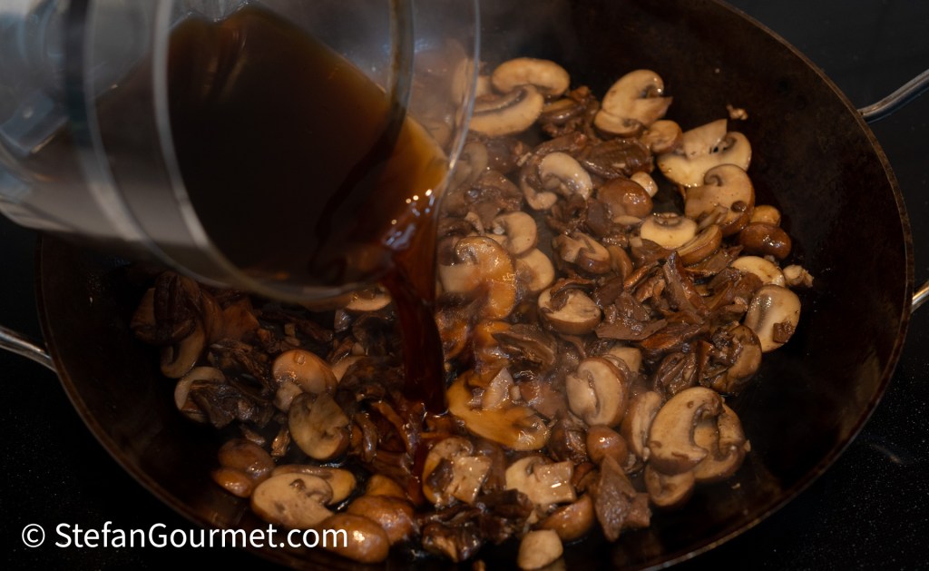 Laat dit zachtjes inkoken. Tot hier kun je de paddenstoelensaus van tevoren maken.