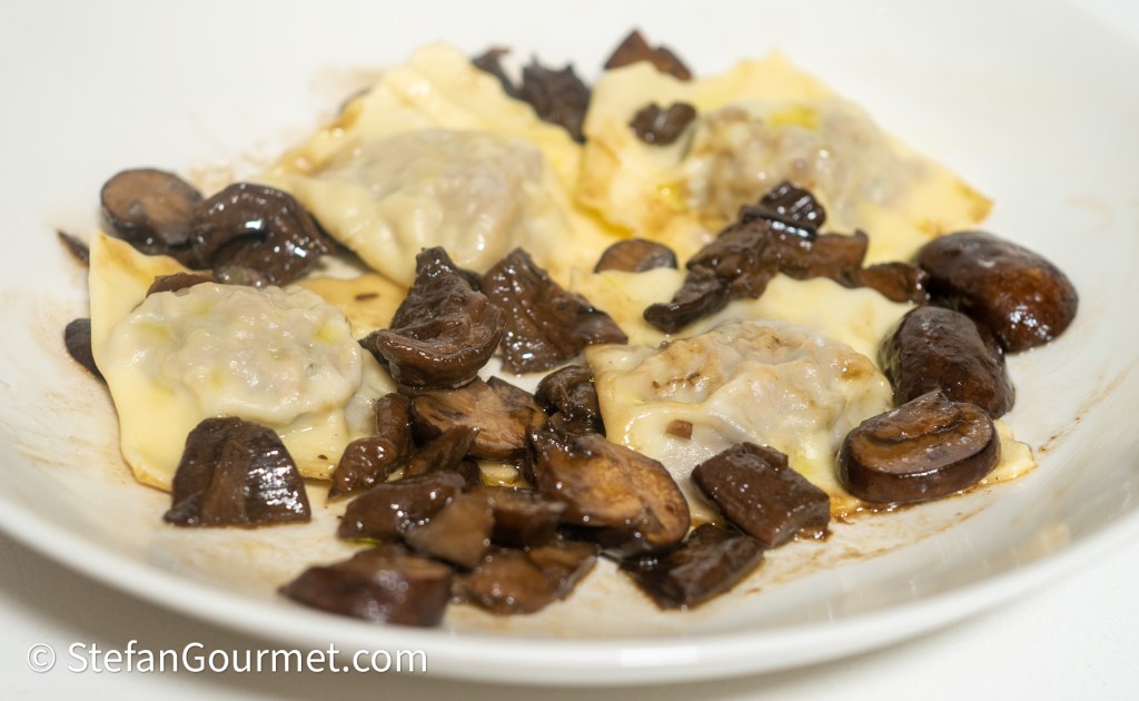 Schep de ravioli met een schuimspaan uit de pan en serveer ze op voorwarmde borden met de paddenstoelensaus. Je kunt eventueel wat hoge kwaliteit extra vergine olijfolie over de ravioli sprenkelen.