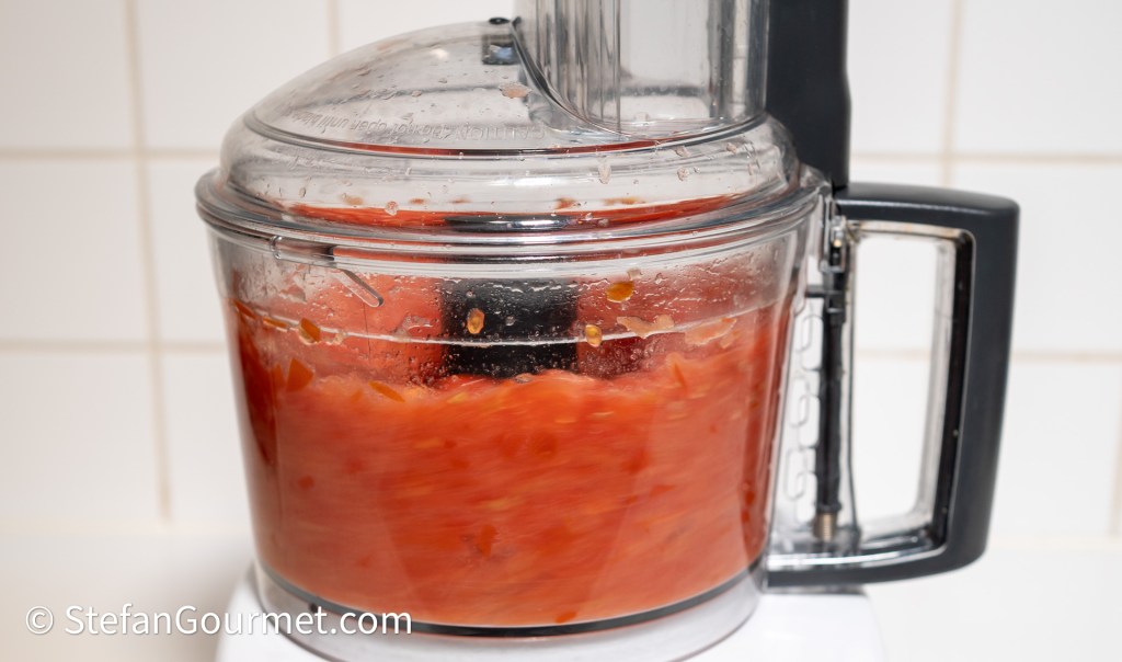 Was de tomaten en snijd ze in kwarten. Doe ze in een keukenmachine of blender.