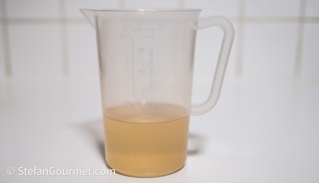 Op deze manier krijg je het tomatenwater. Breng dit op smaak met een beetje Japanse sojasaus. Je moet de soja niet echt proeven; de soja is alleen bedoeld als smaakversterker.