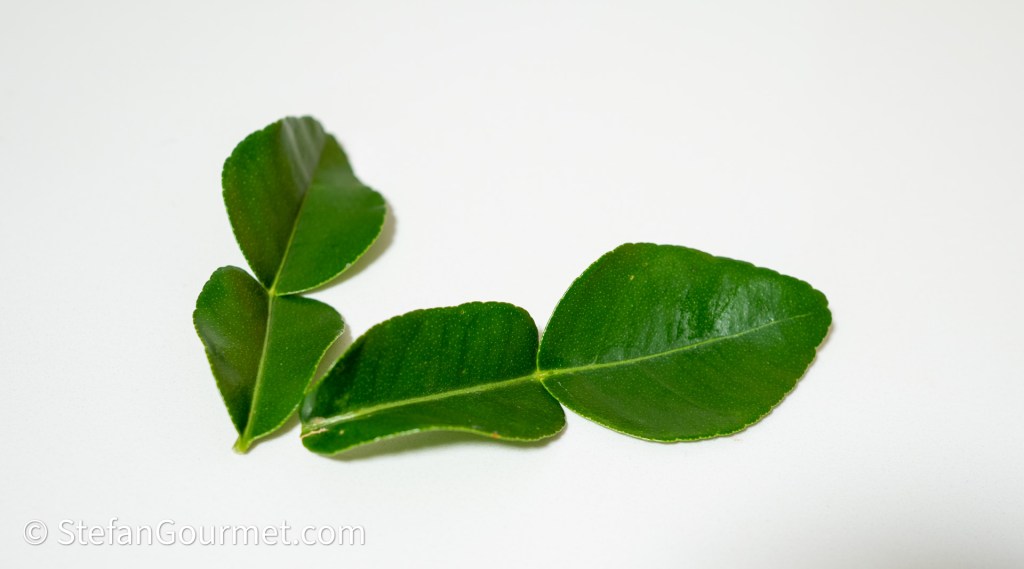 Het blad van kaffierlimoen kun je in de diepvries vinden in Aziatische supermarkten (ik pluk ze van mijn kaffierlimoenboompjes).