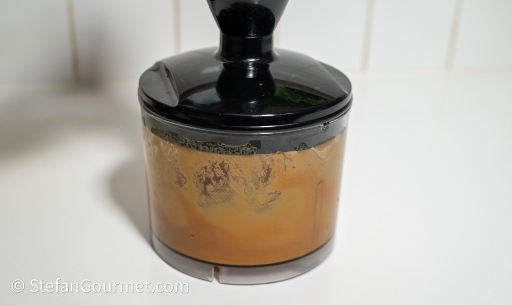 Pureer de volledige inhoud van het zakje met de sous vide gegaarde ganzenlever met een staafmixer. Knijp de zak goed uit zodat je ook al het vet meeneemt. Breng de ganzenlever voor het pureren op smaak met 2 gram zout en 1 gram poedersuiker (dat is 1/4 theelepel zout en 1/4 theelepel poedersuiker als je afgestreken maatlepels gebruikt). Laat de gepureerde ganzenlever eerst ongeveer een uur afkoelen in de koelkast, waarbij het zo af en toe roert. Er zal vet boven komen drijven. Als de ganzenlever gedeeltelijke is opgestijfd en je roert het vet er weer door, zal het niet meer boven komen drijven.