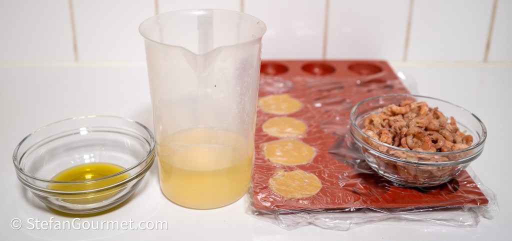 Regelmatig haal ik inspiratie voor een gerecht uit iets wat ik bij een restaurant heb gegeten. Meestal probeer ik het niet precies na te maken, maar een eenvoudige(re) versie te maken waar wel de essentie in terugkomt. Bij de Librije genoten we van ganzenlever met Hollandse garnalen, tomatenwater en limoen. Het leek me leuk om een amuse te maken op basis van dat idee. Ik probeerde het eerst met limoenrasp, maar toen ik het gerechtje voor de tweede keer voorgeschoteld kreeg bij de Librije, realiseerde ik me dat limoenblad beter zou werken. Verder heb ik het zo eenvoudig mogelijk gehouden en ik ben heel tevreden met het resultaat. Voor het beste resultaat kun je pelgarnalen kopen die je zelf pelt, maar dat is een aardig klusje en pelgarnalen zijn best lastig te krijgen, terwijl je gepelde Hollandse garnalen in elke supermarkt kunt kopen.