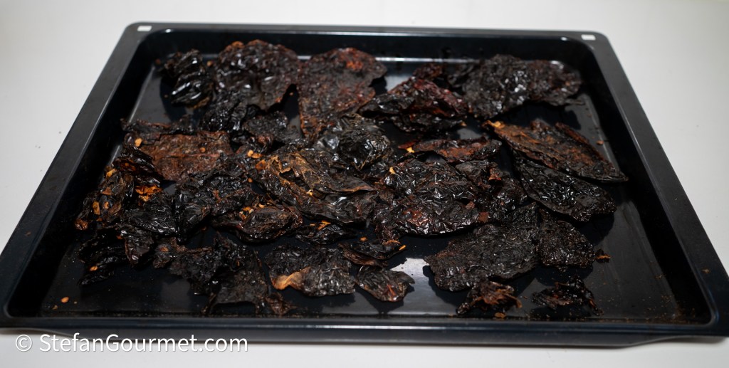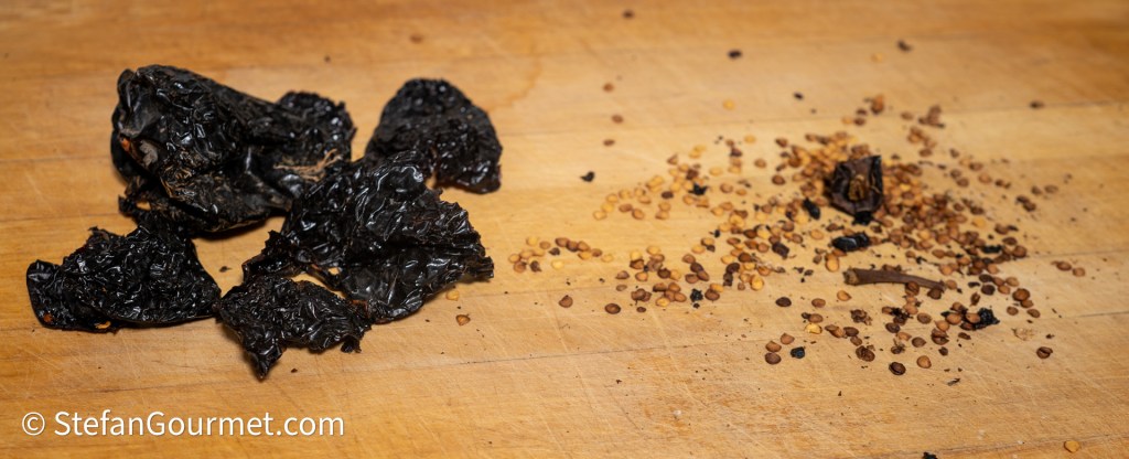 Ik heb recepten gezien waar de gedroogde chilipepers in brand worden gestoken en daarna veel moeite moet worden gedaan om de smaak van as er weer uit te krijgen. Dat lijkt mij een omweg, daarom doe ik het wat rustiger aan en rooster de chilipepers gewoon in de oven.