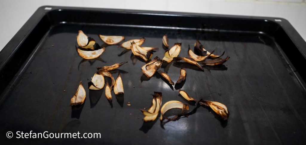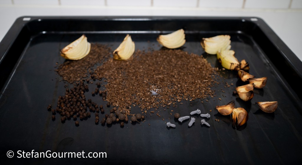 Ik heb daarna de ui uit elkaar gehaald en nog 10 minuten extra geroosterd op 225 graden (in totaal dus 20 minuten), totdat de ui donker was maar niet verkoold.