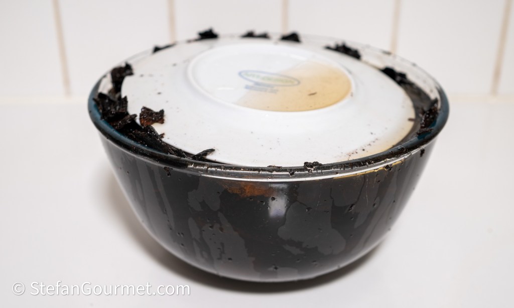 Doe de geroosterde pepers daarna in een kom en giet er koud water bij. Leg er een bord op om de pepers onder water te houden.