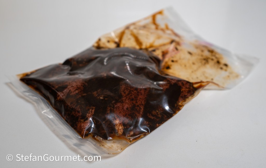 Snijd kalkoendijfilet in grote brokken (van ongeveer 4 centimeter) en meng die met de recado negro. Gebruik daarvoor 10% recado negro ten opzichte van het vlees, dus bijvoorbeeld 30 gram recado negro bij 300 gram kalkoendijfilet. Laat dit bij voorkeur eerst minimaal een paar uur of een nacht marineren in de koelkast (niet strikt noodzakelijk), zodat het zout in het vlees kan trekken voordat de garing begint.