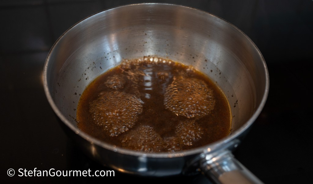 Giet het vocht uit de zak in een pan en breng dit aan de kook. Laat het zachtjes een beetje inkoken.