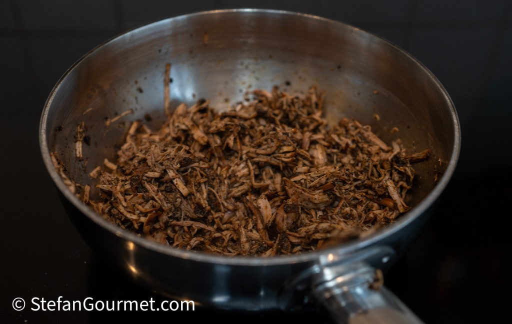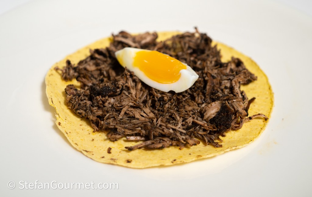 Tijdens onze vakantie in Yucatán in Mexico heb ik erg genoten van het eten. Voor lunch gingen we vaak taco’s eten. Taqueria Honorio in Tulum is bekend geworden omdat René Redzepi daar lyrisch over was toen Noma een popup was in Tulum. Daar proefde ik behalve de taco’s met Cochinita Pibil ook de taco’s met Relleno Negro de Pavo (zwarte vulling van kalkoen). De vulling is zwart omdat deze wordt gemaakt met recado negro, een saus met geblakerde chilipepers. Relleno Negro wordt in Yucatán ook vaak geserveerd met een But erbij, dat is een gehaktbal van varkensvlees met een hardgekookt ei in het midden. Maar bij Honorio zat er alleen een plakje hardgekookt ei bovenop en dat is hoe ik het ook heb gemaakt. De recado negro geeft een bijzondere diepe smaak aan de kalkoen. En omdat het vocht na het pullen weer door het gegaarde kalkoenvlees wordt geroerd, is de pulled turkey lekker sappig.