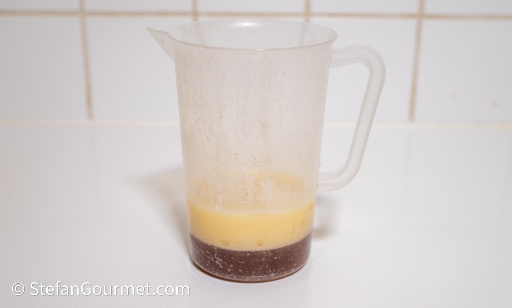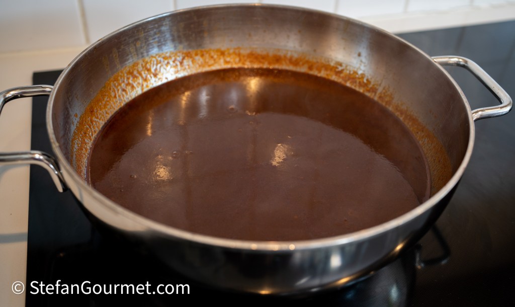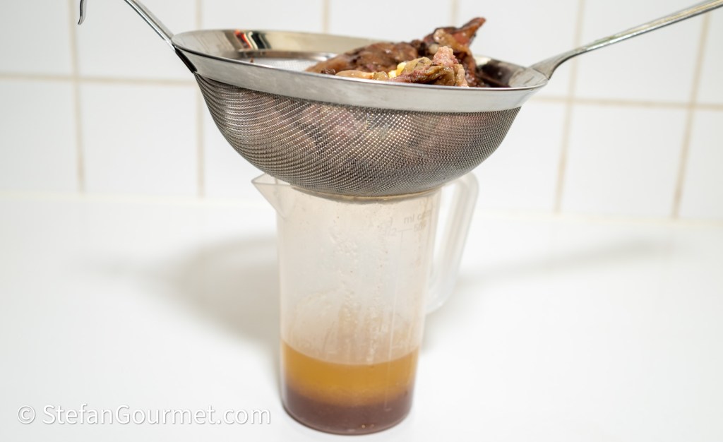 Doe de gezeefde jus in een pan en houd deze warm, tegen de kook aan.