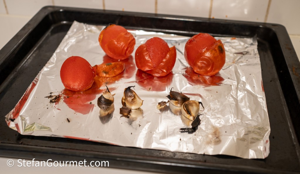 Rooster 4 romatomaten, 1 ui in kwarten, en 8 ongepelde teentjes knoflook onder de grill in de oven. Plaats het rooster dichtbij het grillelement. In 5 tot 10 minuten is alles mooi geblakerd.