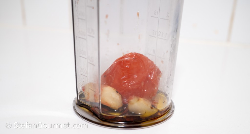 Gebruik een staafmixer om de olijfolie met de arbol, alle knoflook en 1 van de tomaten…