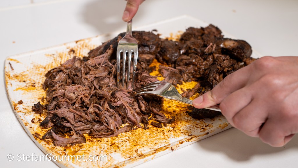 Haal het vlees uit de pan en ‘pull’ het uit elkaar met twee vorken.