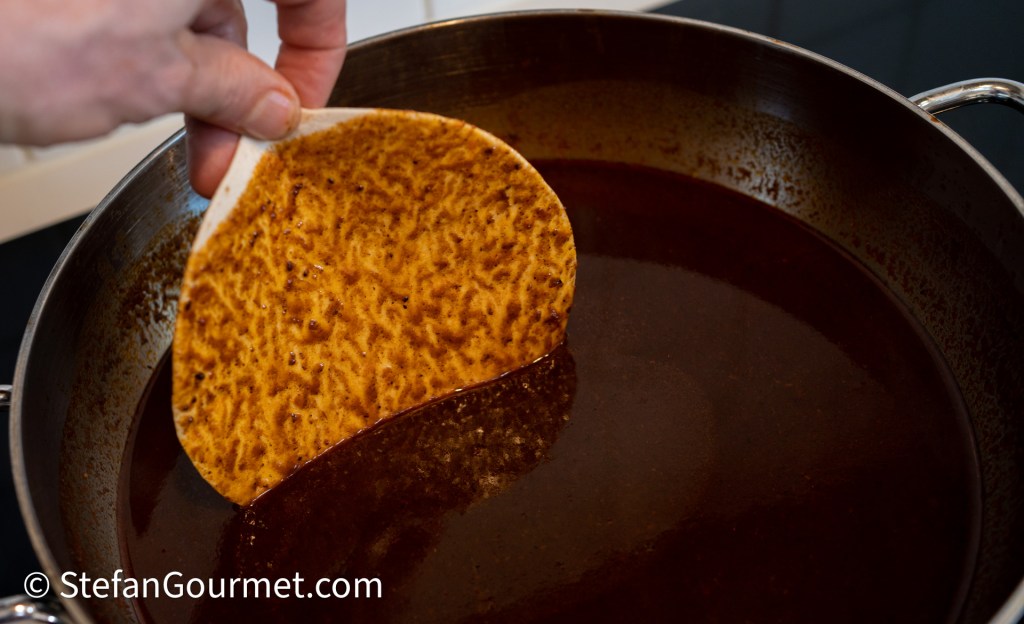 Voeg wat rundvet toe aan de koekenpan en laat het smelten. Doop een tortilla in de jus.