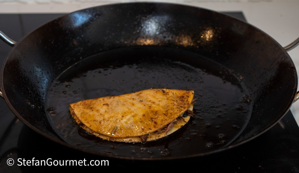 Draai hem daarna om, waarbij je hem omdraait met de dichte kant naar beneden om te voorkomen dat het vlees eruit valt. Laat hem ook aan die kant nog even bakken totdat hij bruin is. Intussen is er, afhankelijk van het formaat van je pan, ruimte om met de volgende tortilla aan de slag te gaan.