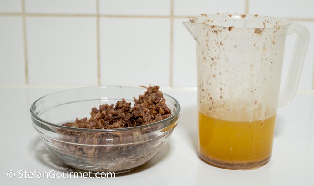 Het uitsmelten van het vet gaat helaas niet goed op dezelfde temperatuur waarop het vlees gegaard wordt; met 48 uur garen op 68 graden krijg je nog niet de helft van het vet eruit. Het vet moet daarom apart gegaard worden, een nachtje op 85 graden is voldoende. Op de foto hierboven kun je zien hoeveel vet er nog uit kwam op 85 graden, dat was meer dan de hoeveelheid vet die eruit kwam na twee dagen op 68 graden. In plaats van het vet zelf uitsmelten kun je natuurlijk ook kant-en-klaar uitgesmolten rundvet kopen.