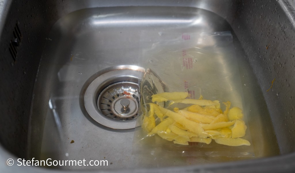 Zelfgemaakte limoncello is lekkerder dan de meeste limoncello die je in de winkel kunt kopen. Ik maak het al een jaar of tien met enige regelmaat (hier het recept op mijn Engelstalige blog). Citroenen schillen, 4 tot 6 weken in pure alcohol (95%) laten trekken, dan suikersiroop erbij, en voor het beste resultaat nog weer even wachten. Ik had al wel vaker berichten gezien dat ook sous vide zou kunnen in 2 uur in plaats van minimaal 4 weken, maar nooit veel aandacht aan besteed. Dat kan immers nooit net zo lekker worden, dacht ik. Maar dat weet ik natuurlijk pas zeker als ik het ook heb geprobeerd. En dus toch maar eens limoncello sous vide gemaakt.