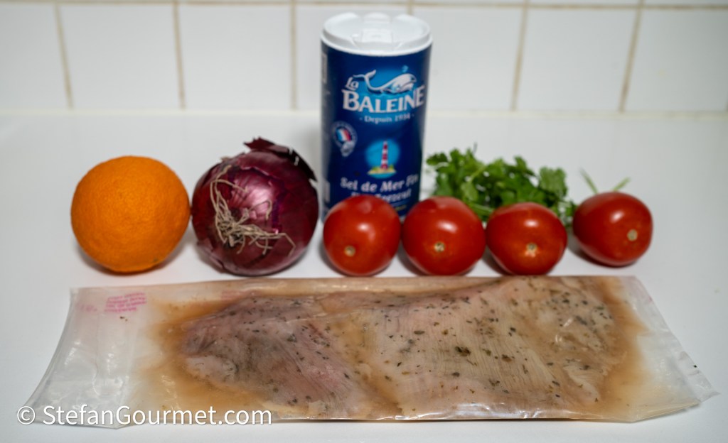 Een populair gerecht in Yucatán (Mexico) is Poc Chuc. “Poc” betekent roosteren in het Maya en “Chuc” betekent houtskool. De naam van het gerecht zegt dus alleen iets over de bereidingswijze, maar als er verder niets bij staat dan is het op houtskool geroosterd varkensvlees. Dat wordt dan eerst gemarineerd, en in Yucatán doen ze alles met sap van pomerans (een soort bittere/zure sinaasappel), dus dat geldt ook hier. Het recept is vrijwel gelijk aan dat voor Octopus Poc Chuc waarover ik al eerder heb geschreven, maar dit is zo lekker dat het toch een eigen artikel verdient. In Yucatán wordt dit meestal gemaakt met varkensfilet en dan is het vlees erg droog ondanks de marinade. Als oplossing heb ik het gemaakt met iberico secreto. Iberico is een ras varkens uit Spanje met mooi gemarmerd vlees (het vlees is doorregen met vetadertjes, net als wagyu rundvlees). Secreto betekent letterlijk het geheim van de slager en het is een lapje bij de schouder dat heel smakelijk is. Door het vlees 24 uur sous vide te garen op 57 graden wordt het heerlijk mals en blijft het toch roze en sappig. En daarmee is deze poc chuc veel lekkerder dan hoe ik het in Mexico kreeg in een restaurant. Zoals bijna alles wordt ook dit gerecht in Mexico geserveerd met maistortilla’s, zodat je er zelf je eigen taco’s mee kunt maken.