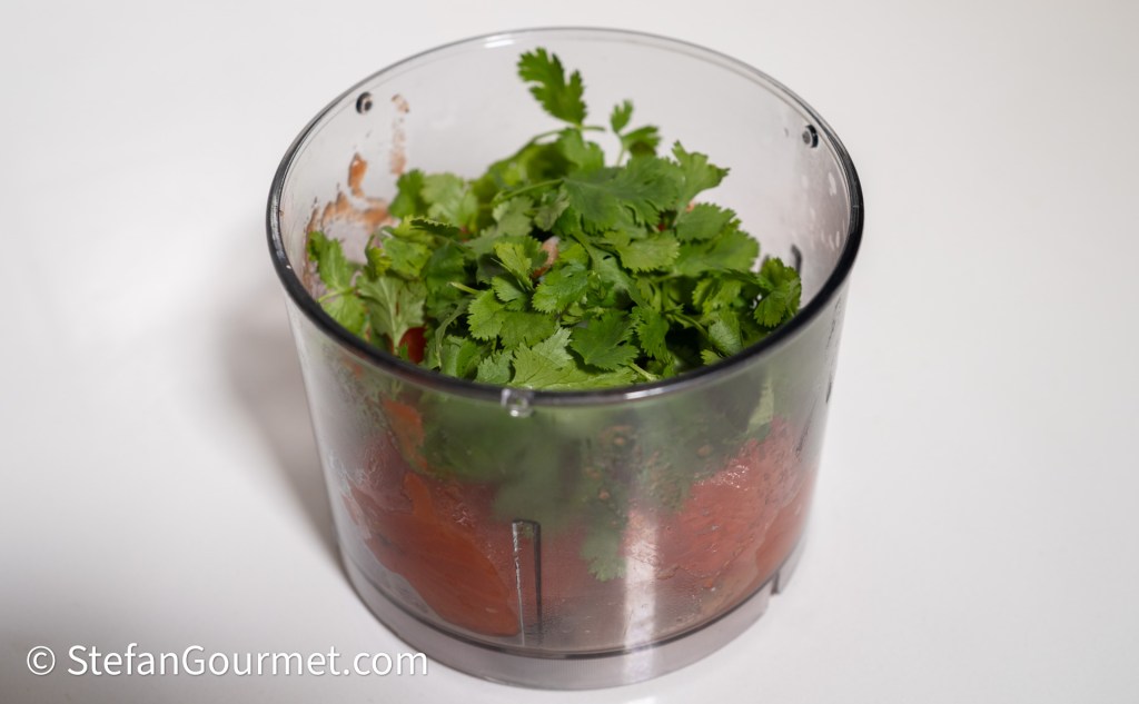 Doe de tomaten in de blender met een handje verse koriander (alleen het blad, niet de steeltjes) en een theelepel zout.