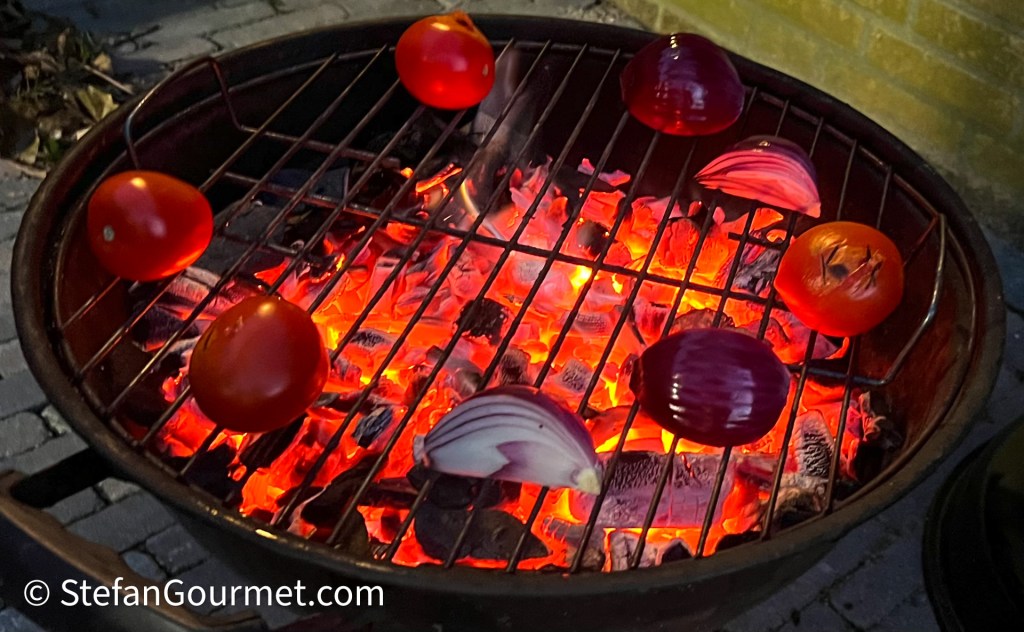 Maak eerst de salsa en de uien. Rooster daarvoor de tomaten en de uien op de BBQ, het liefst met deksel voor extra rooksmaak, totdat ze mooi geblakerd zijn.