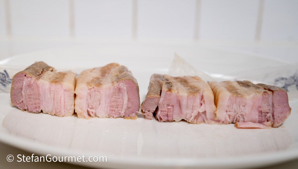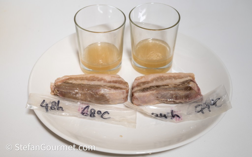 Daarvoor sneed ik een stuk buikspek in tweeën en gaarde de ene helft voor 48 uur op 68 graden en de andere helft voor 24 uur op 74 graden.