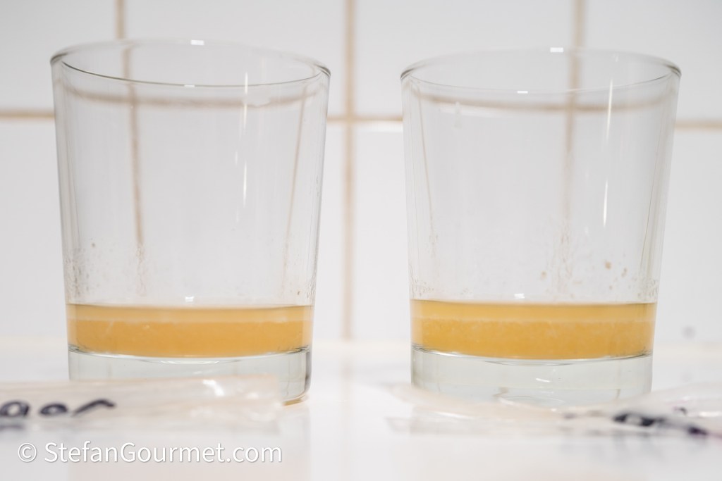 Op 74 graden kwam er duidelijk meer vocht uit vlees in de zak, namelijk 25% van het oorspronkelijke gewicht in plaats van 18% op 68 graden. Op de foto (68 graden links, 74 graden rechts) kun je zien dat er vooral iets meer vet uit het vlees is gesmolten op 74 graden (dat drijft bovenop).