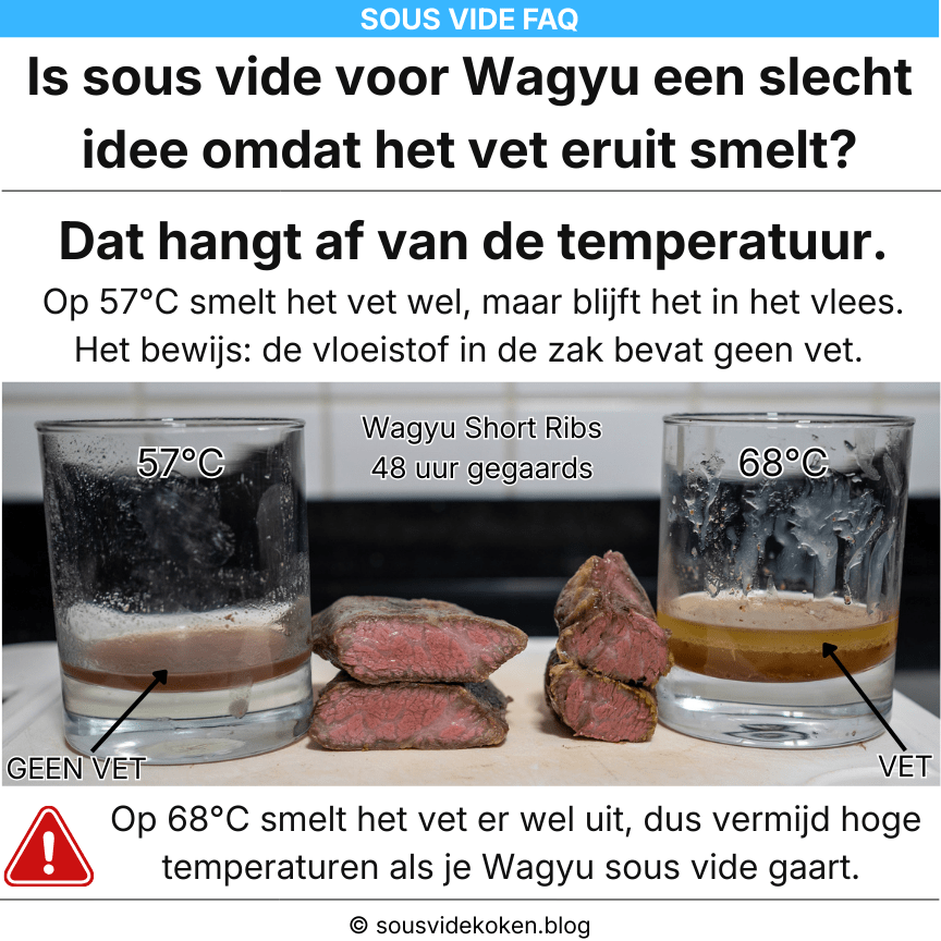 Dit misverstand komt waarschijnlijk voort uit verwarring tussen ‘smelten’ en ‘uitsmelten’ (renderen). Het vet in Wagyu smelt weliswaar bij 57°C, en zelfs bij veel lagere temperaturen. Het vet zit echter opgesloten in het bindweefsel dat het op zijn plek houdt. Bij 57°C wordt dit bindweefsel langzaam zachter — waardoor de short ribs na 48 uur mals worden — maar het bindweefsel trekt nauwelijks samen (wat ervoor zou zorgen dat gesmolten vet en sappen uit het vlees worden geperst) en het blijft sterk genoeg om het vet binnen te houden. Bij 68°C trekt het vlees echter veel meer samen en wordt het bindweefsel afgebroken van collageen naar gelatine, waardoor het vet kan ontsnappen.